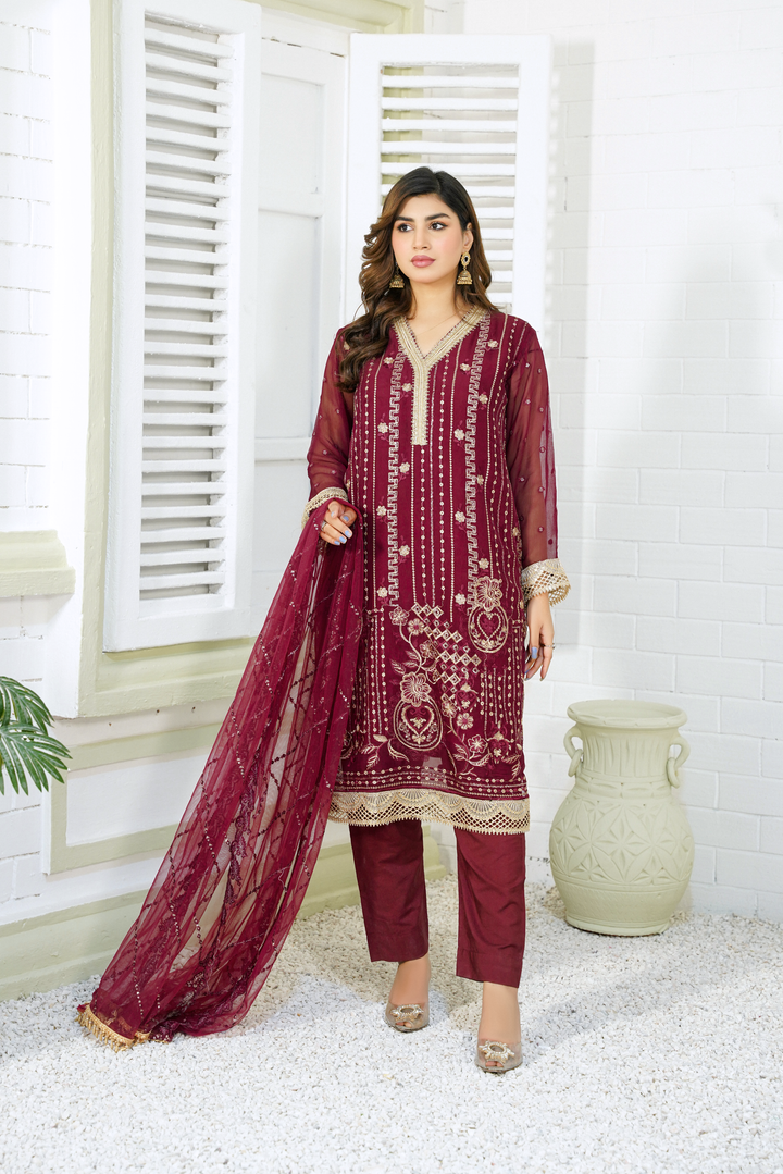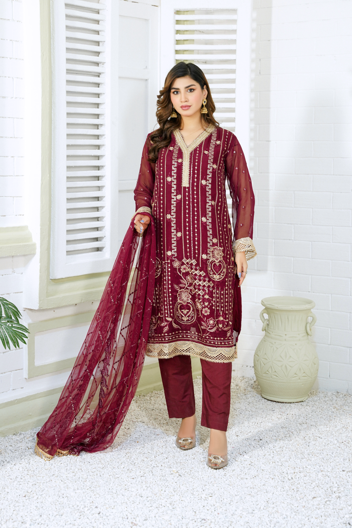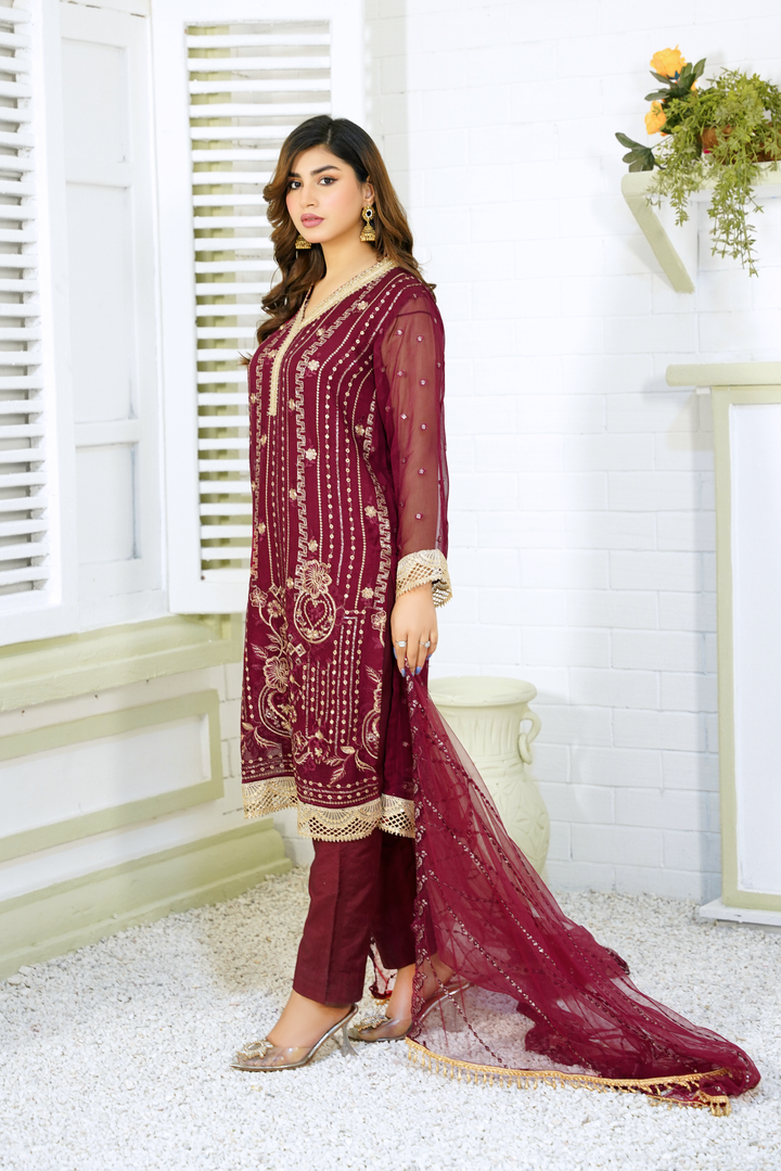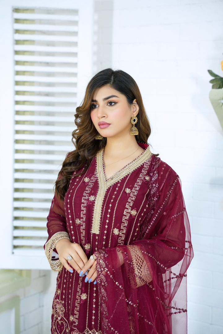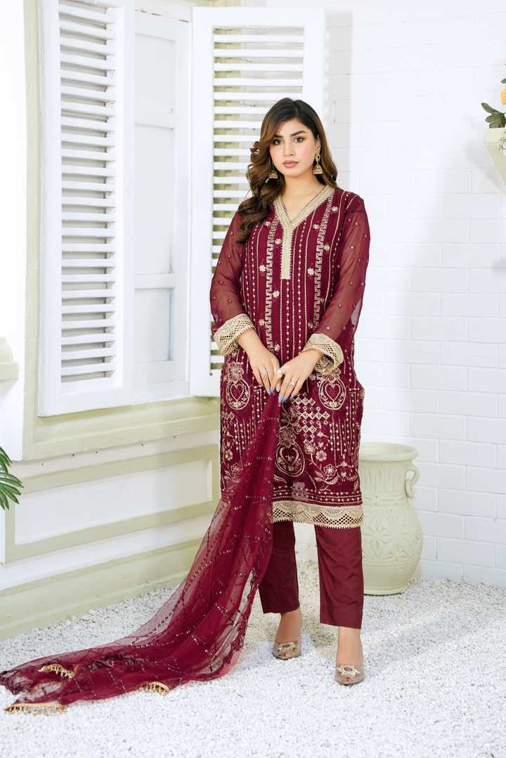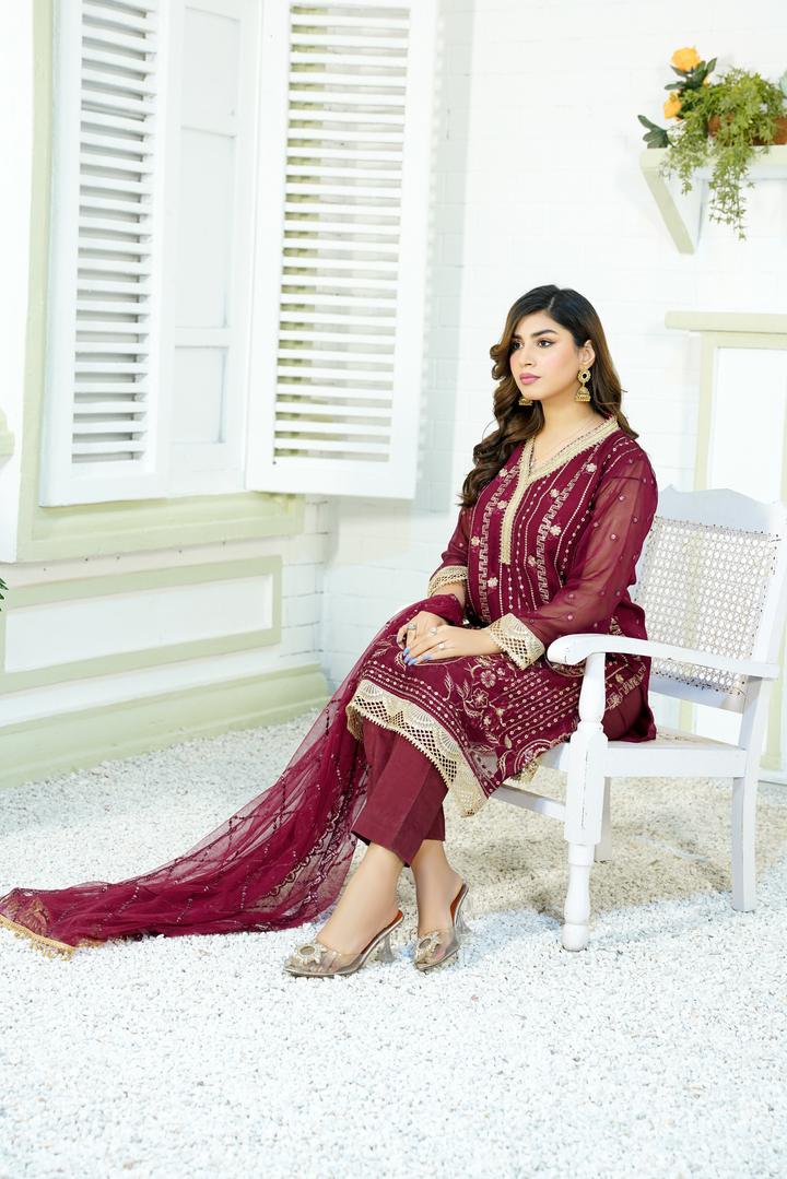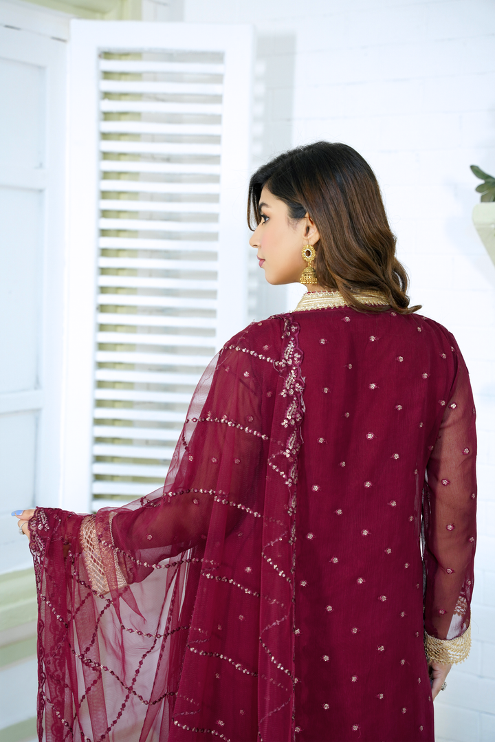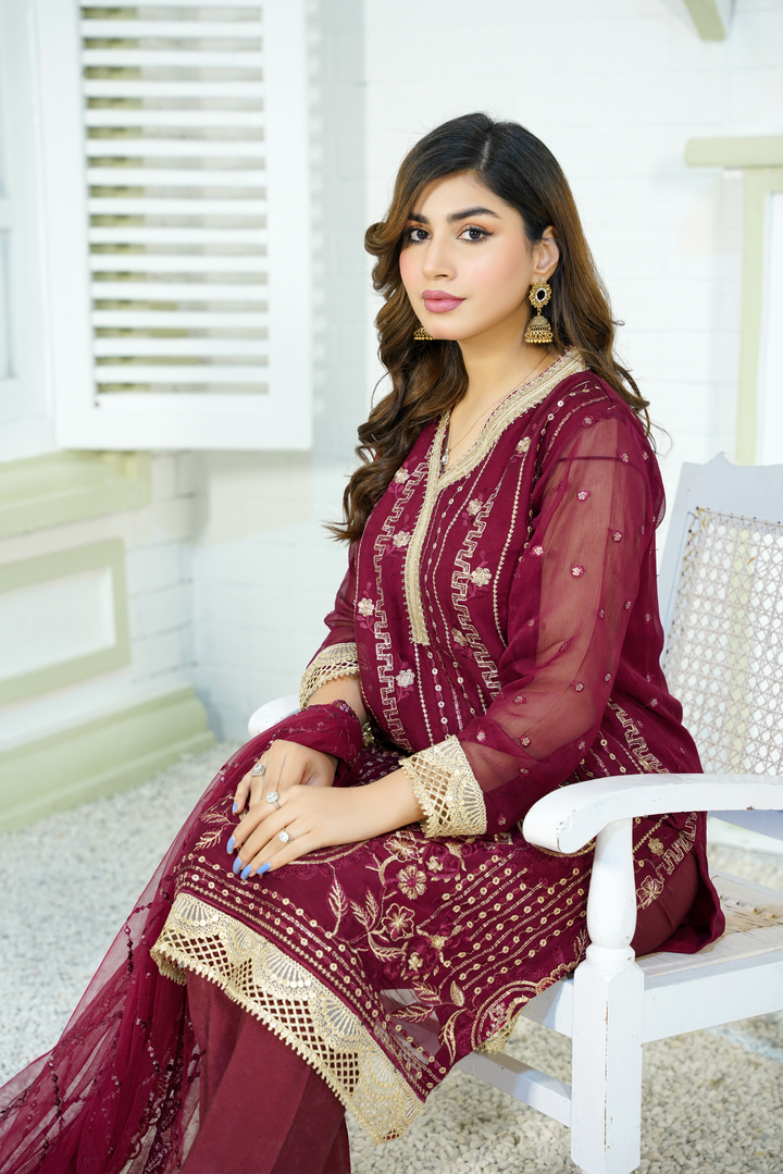 Let your style bloom in soft chiffon. This Athena ensemble brings the essence of luxury pret Pakistan to life with its refined detailing and classic reshmi suit design. Crafted in breathable, flowy chiffon, this outfit is perfect for intimate festivities, formal dinners, and graceful day-to-night transitions.