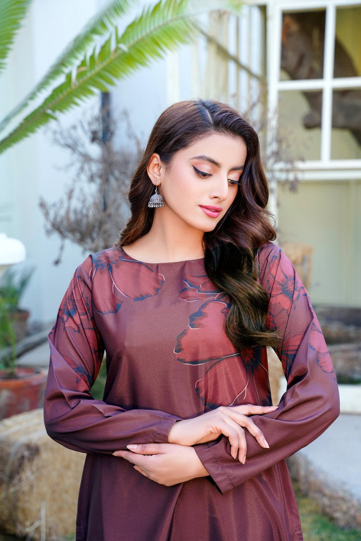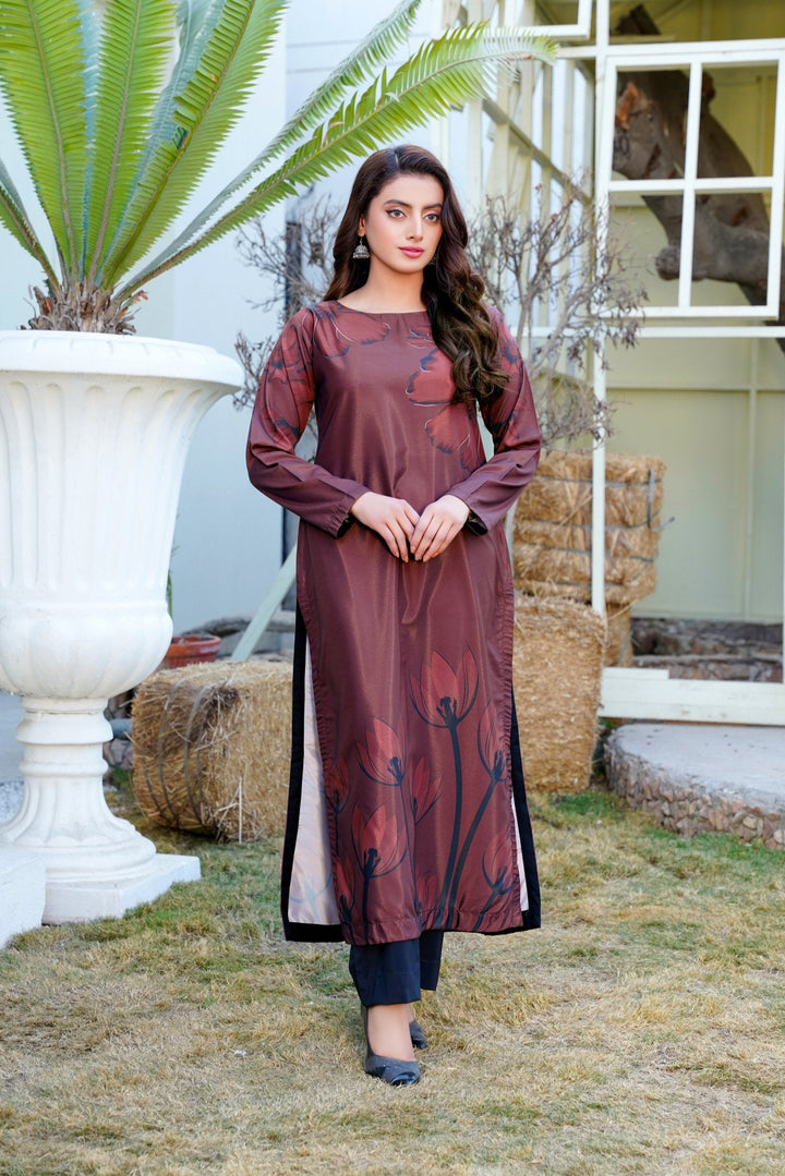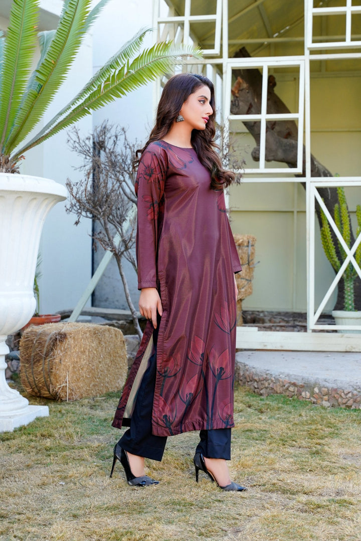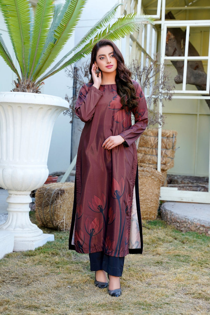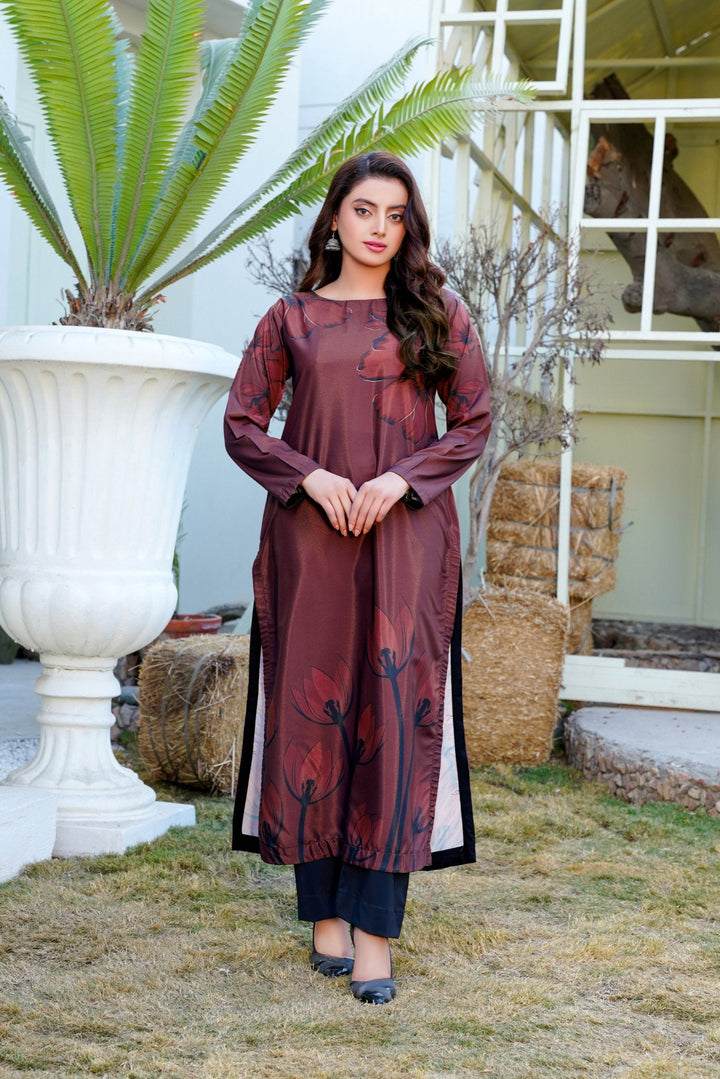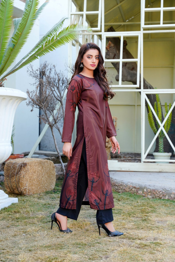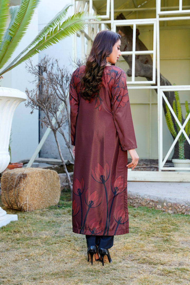 Introducing our stunning reddish-brown long shirt, meticulously crafted with intricate floral detailing. Made from luxurious Korean crepe, this garment radiates elegance and sophistication. Its longer length offers versatility, suitable for various occasions. Elevate your wardrobe with this timeless piece, effortlessly combining style and comfort in one exquisite design.