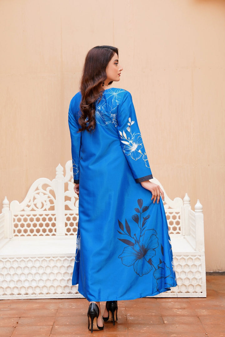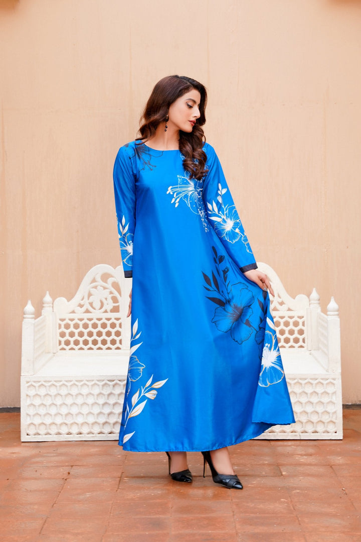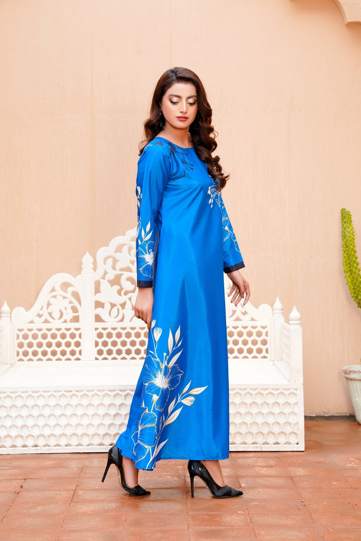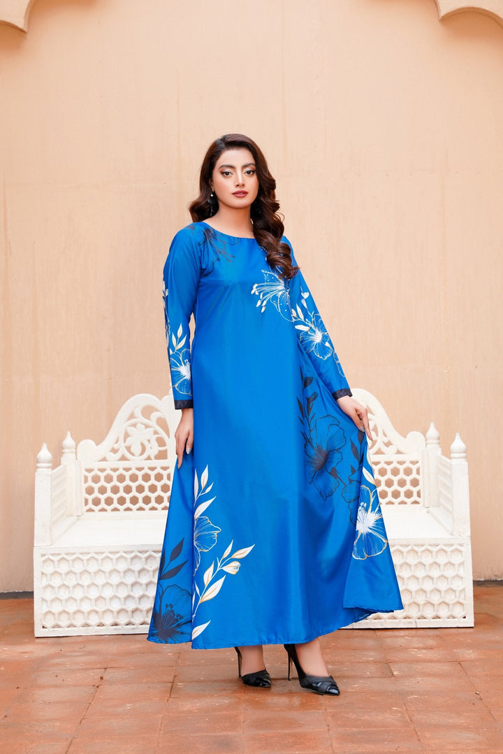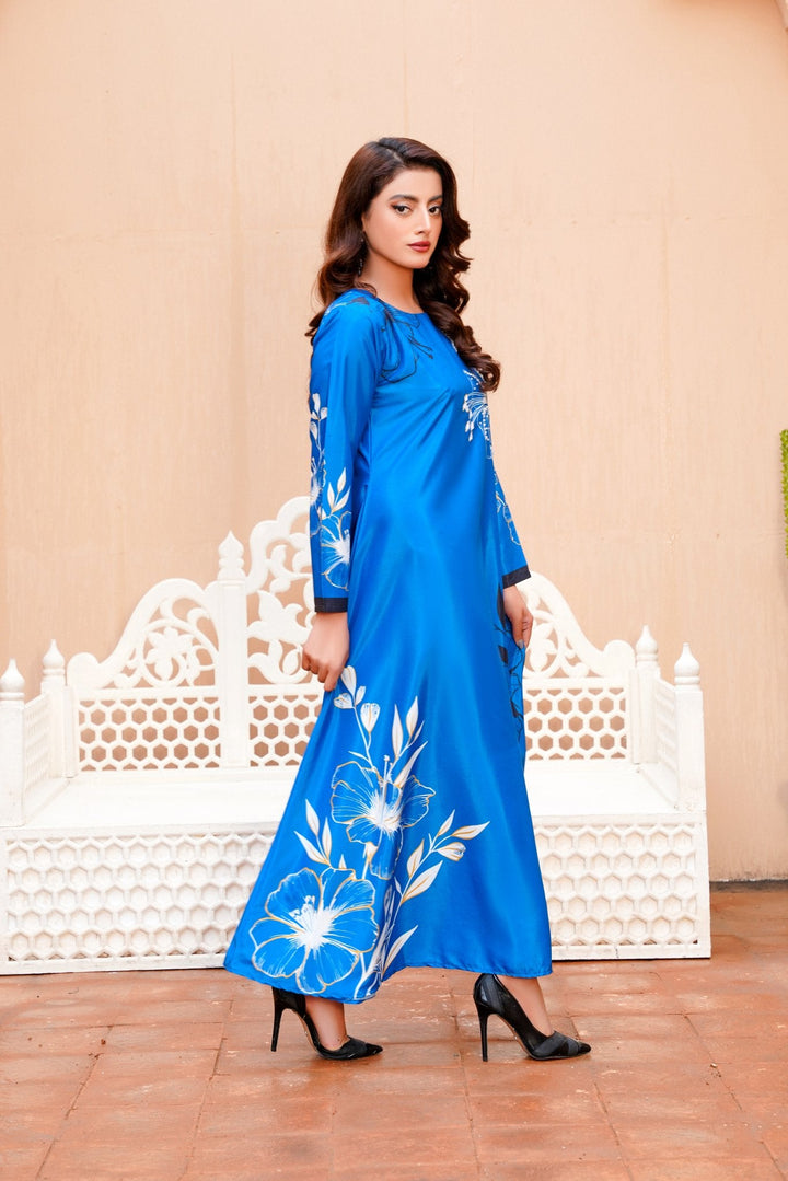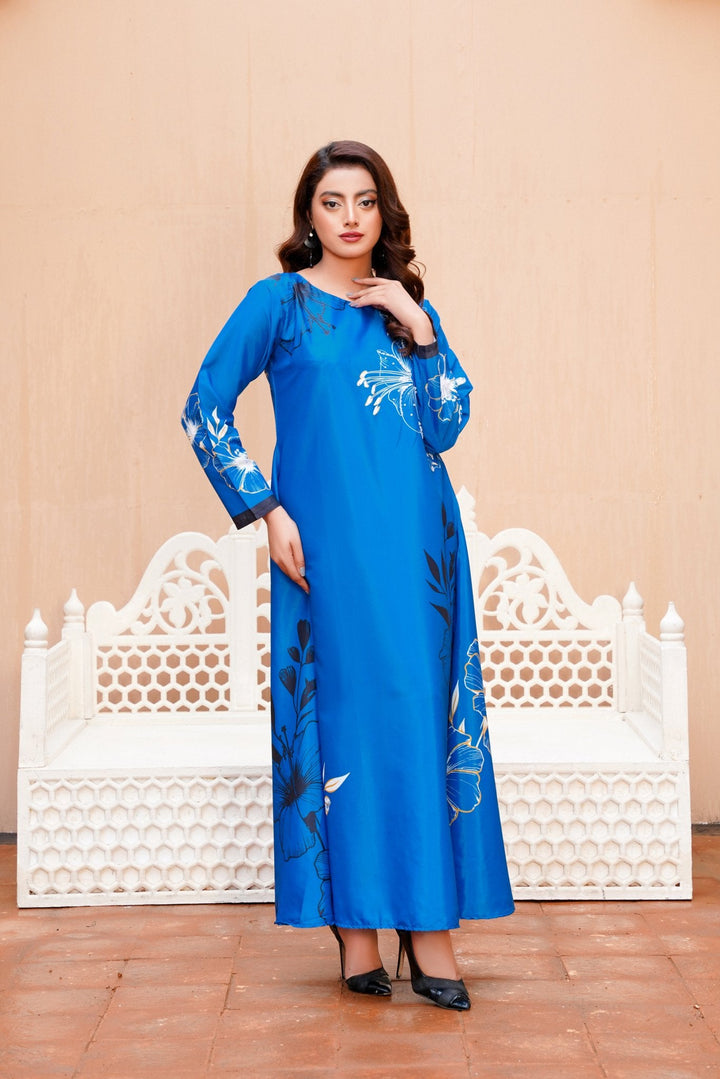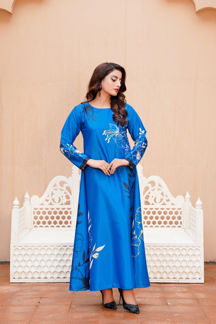 A perfect choice for fans of western wear in Pakistan, this dress pairs beautifully with nude heels or metallic accessories for a polished look. Whether you're attending an evening soiree or a formal dinner, this long dress ensures you're the center of attention—without even trying.