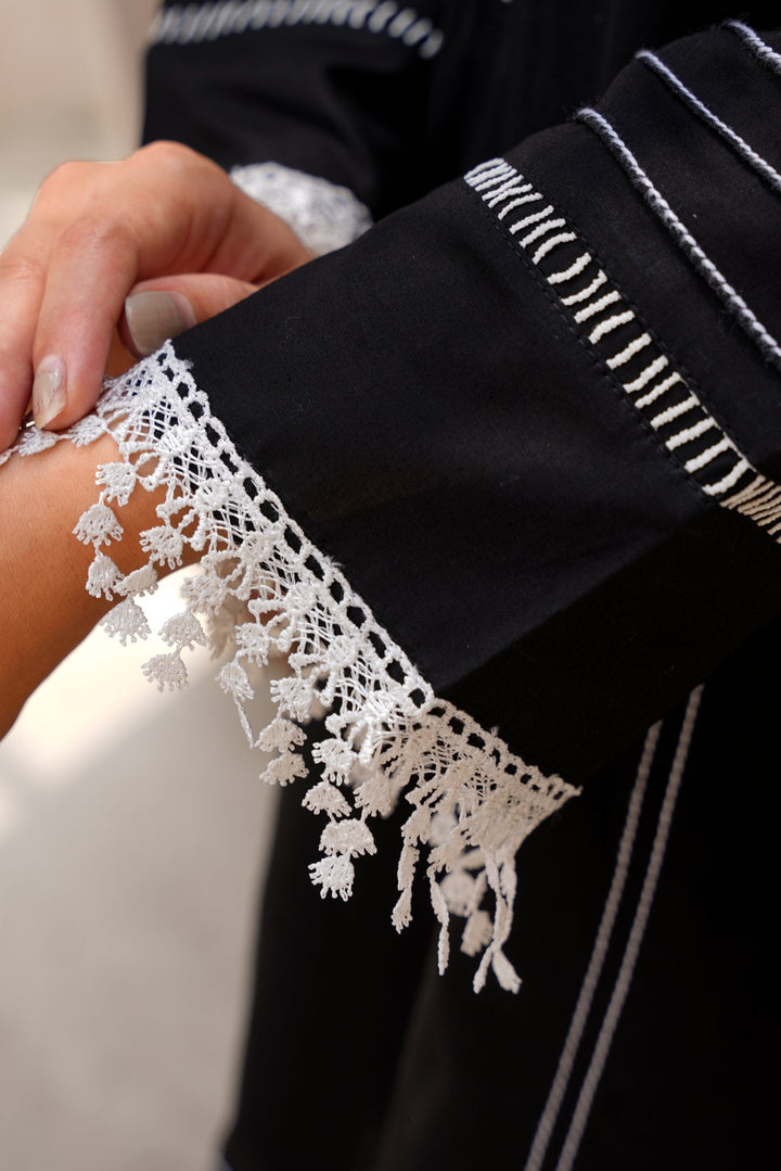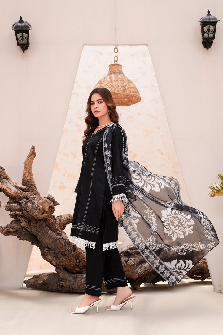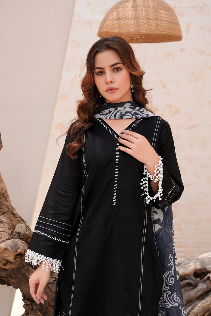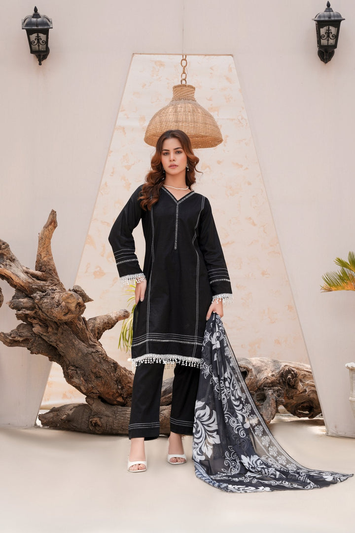Crafted as a 3 piece stitched suit online Pakistan women can trust for comfort and style, it includes a tailored kameez, straight trousers, and a lightweight dupatta. Whether you're heading to work, attending a formal dinner, or looking for a subtle Eid look, this black shalwar kameez pick checks every box.