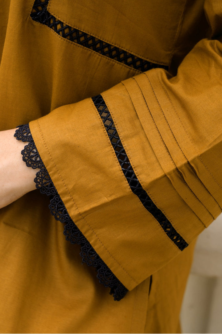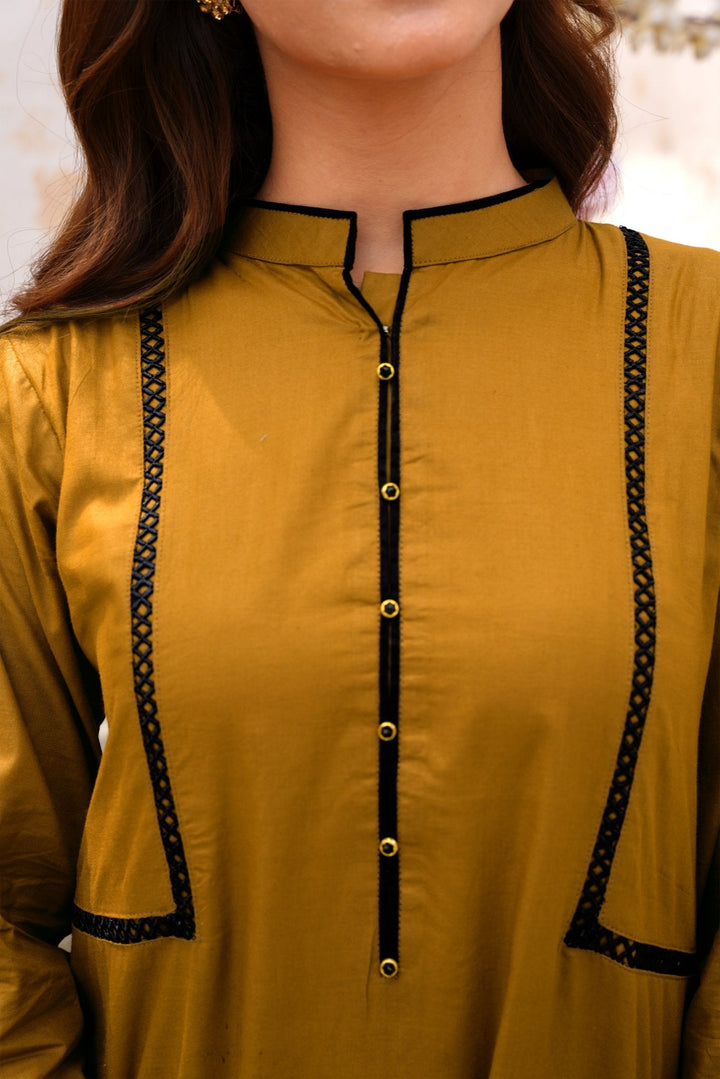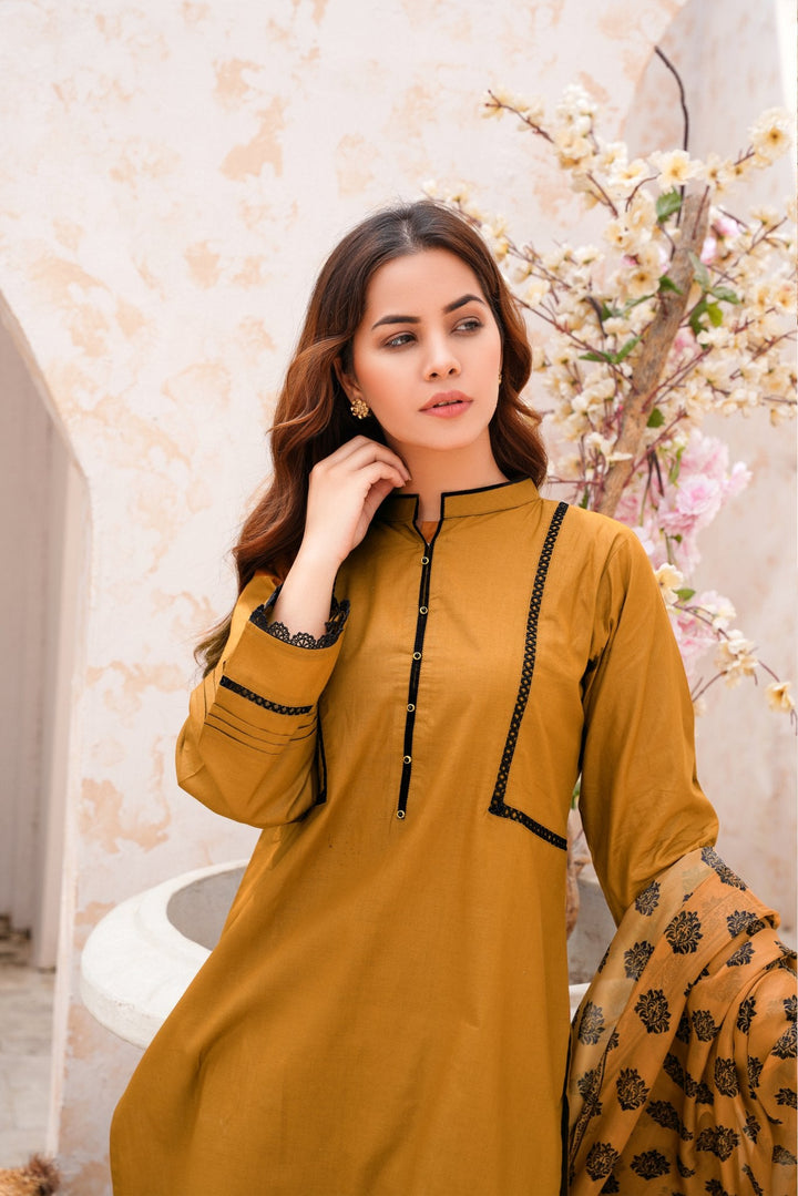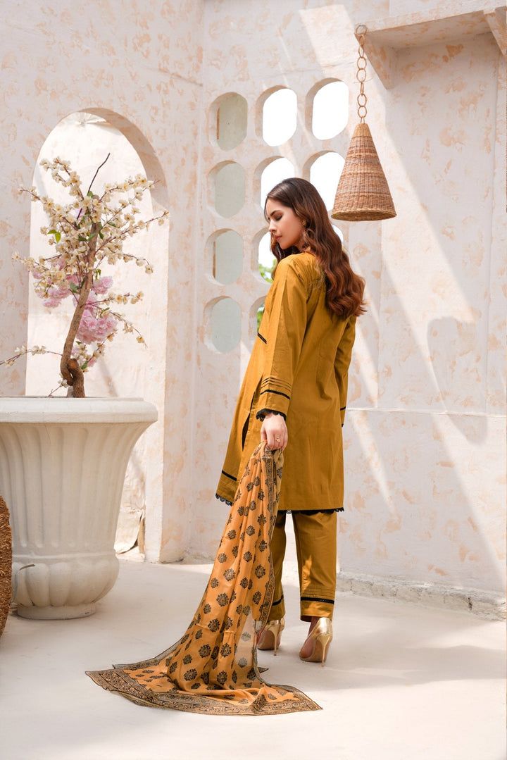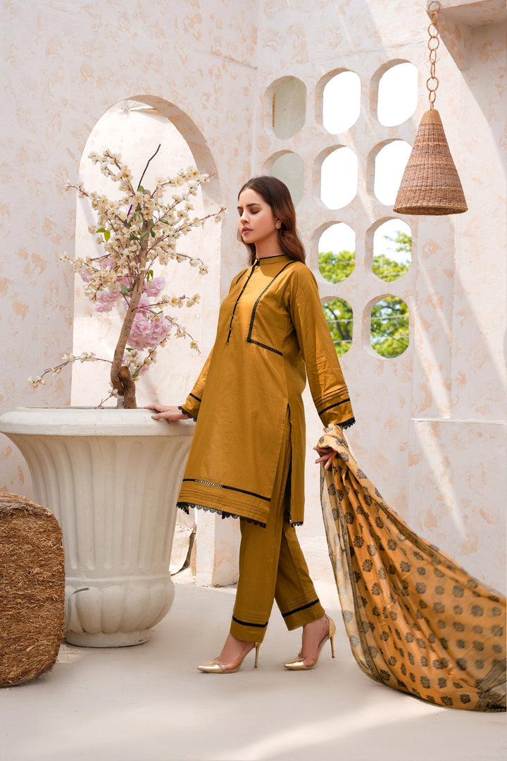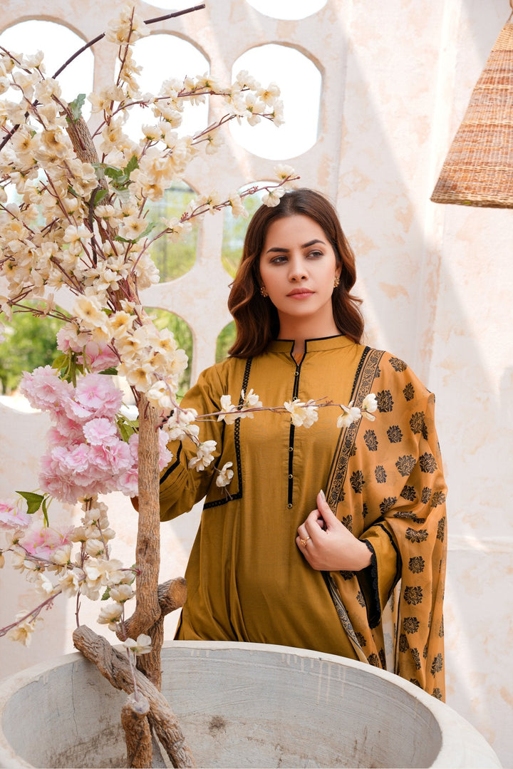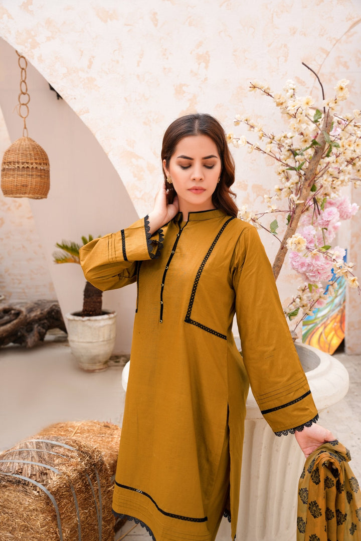 Step into seasonal elegance with this plain lawn dress design, crafted in a soothing camel tone. Designed with a trendy short kameez design and paired with a vibrant printed dupatta, this outfit strikes the perfect balance between simplicity and charm.