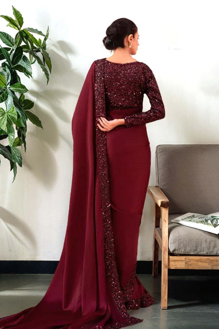 Elevate your traditional wardrobe with the Huzan Maroon Saree, a stunning maroon saree crafted to perfection for the modern woman. This exquisite Pakistani saree features intricate sequence work that adds a glamorous shimmer to every drape.