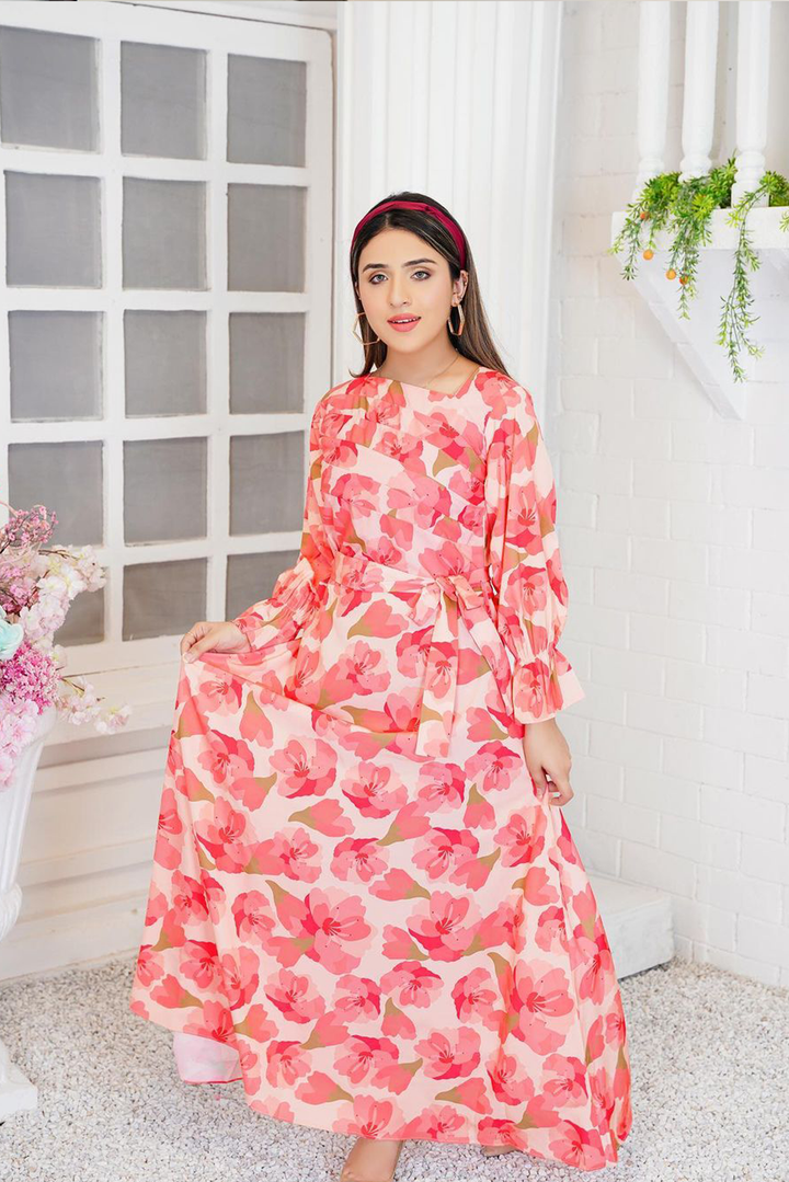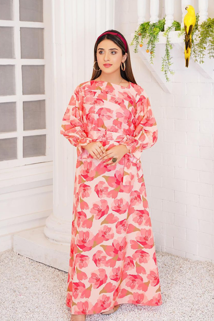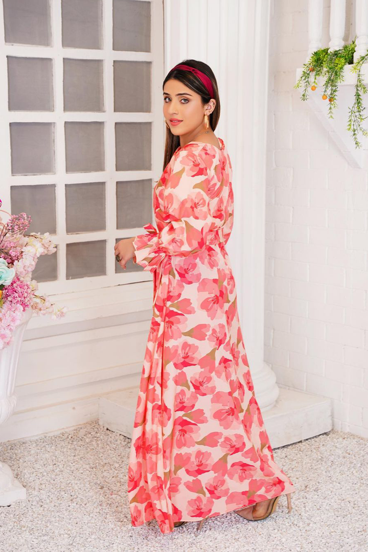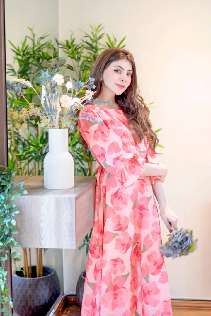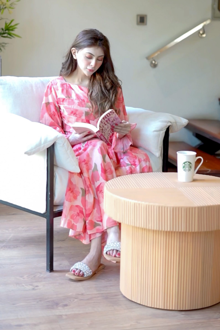 Embrace effortless elegance with Athena Apparels' Hazel Pink Floral Maxi. This summer frock for ladies showcases a soft pink hue adorned with a delicate floral design, capturing the essence of femininity and grace. Crafted from breathable fabric, it ensures comfort during warm days, making it an ideal choice for both casual outings and semi-formal events. The maxi's flowing silhouette reflects contemporary western dresses in Pakistan, offering a blend of traditional charm and modern style. Whether paired with sandals for a daytime look or heels for an evening gathering, this dress is a versatile addition to any wardrobe.