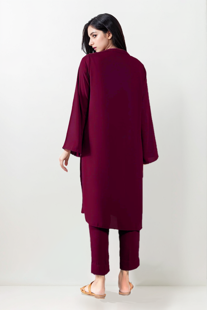 Crafted in a rich mehron color, this 2 piece suit design features a sleek long shirt paired with straight trousers, making it a timeless wardrobe staple. The minimalist silhouette reflects elegance, while the deep tone adds a refined boldness ideal for both daytime events and evening wear.