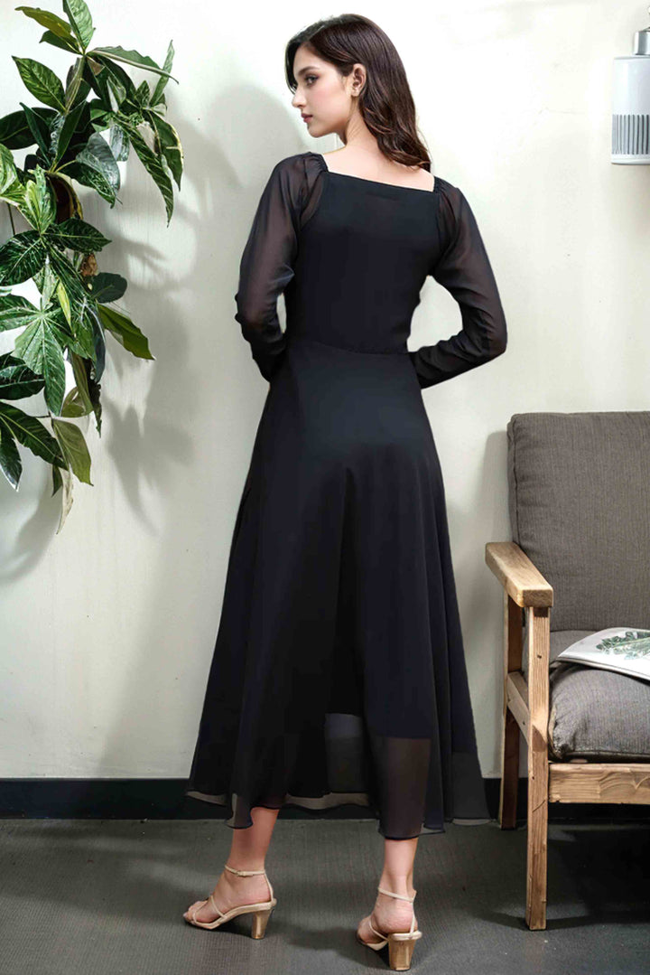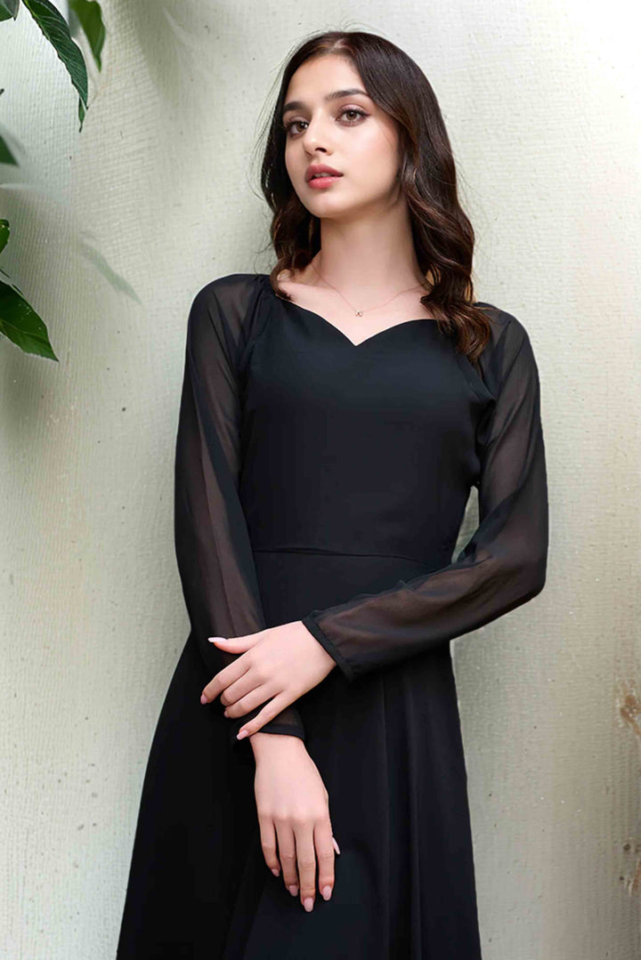 Step into effortless elegance with our black chiffon frock design – a versatile piece that flows like a black gown and drapes like a dreamy black maxi. Crafted with lightweight chiffon, it features a flattering silhouette, soft gathers, and graceful fall that makes it perfect for both formal evenings and festive occasions. Designed to offer a modern yet timeless look, this black beauty is your go-to for a confident and sophisticated style.