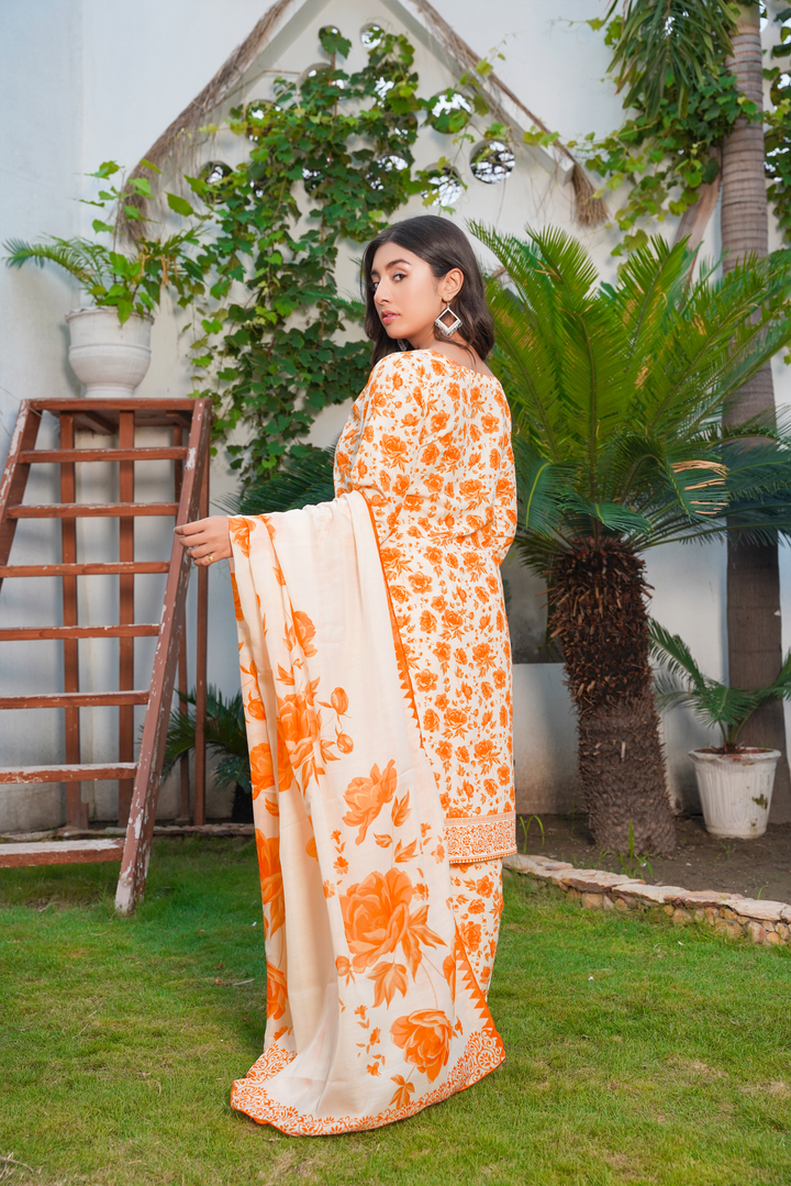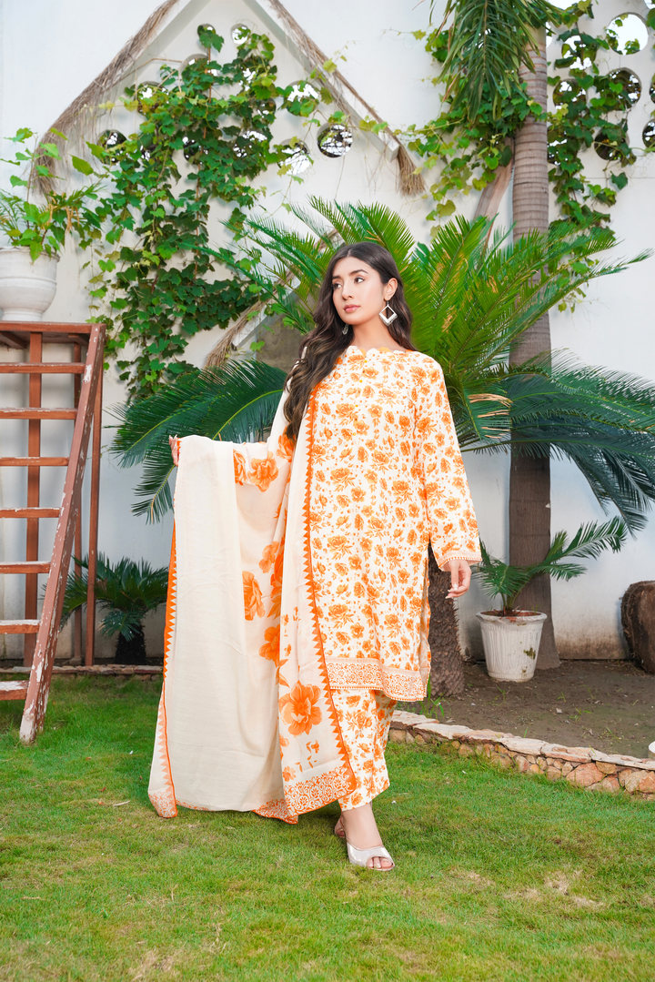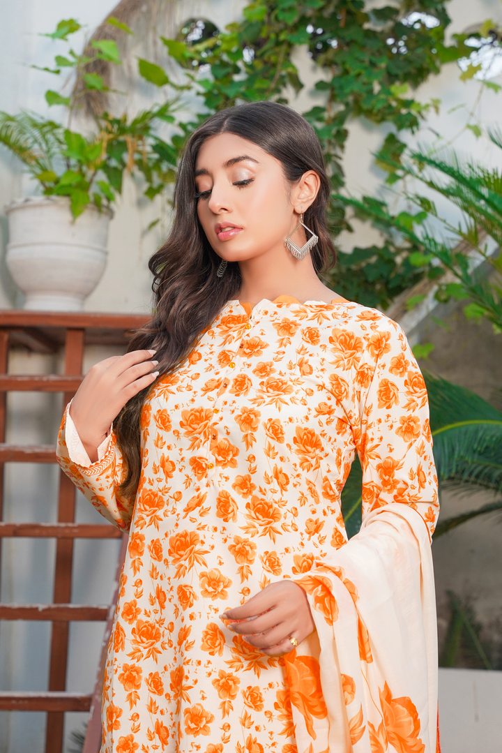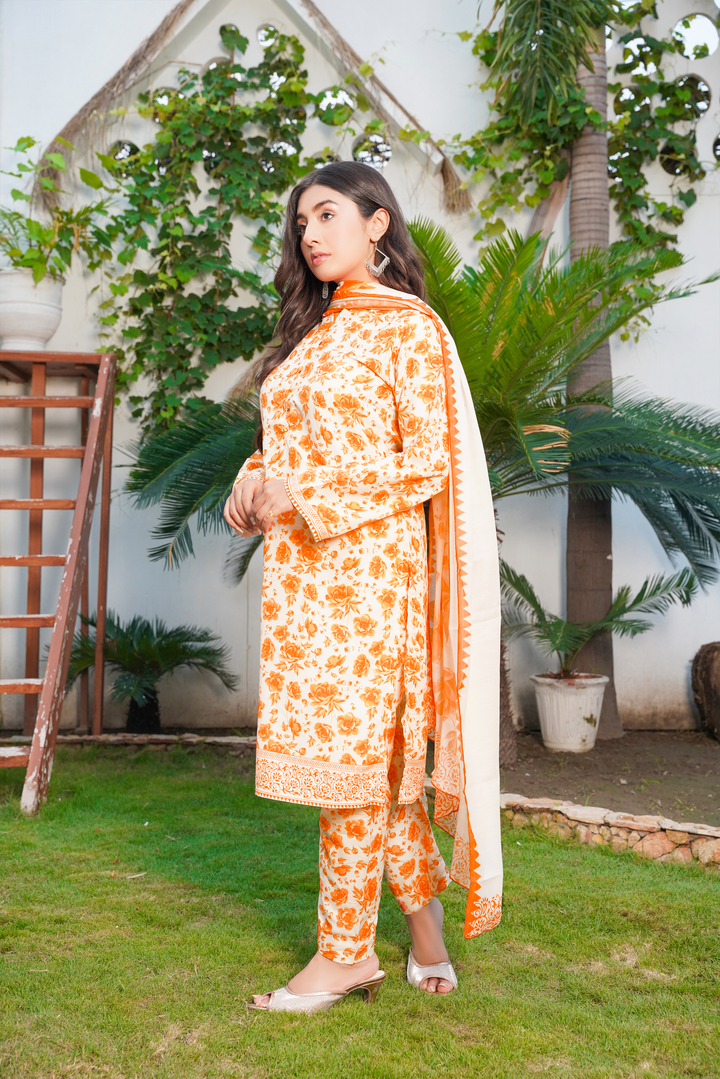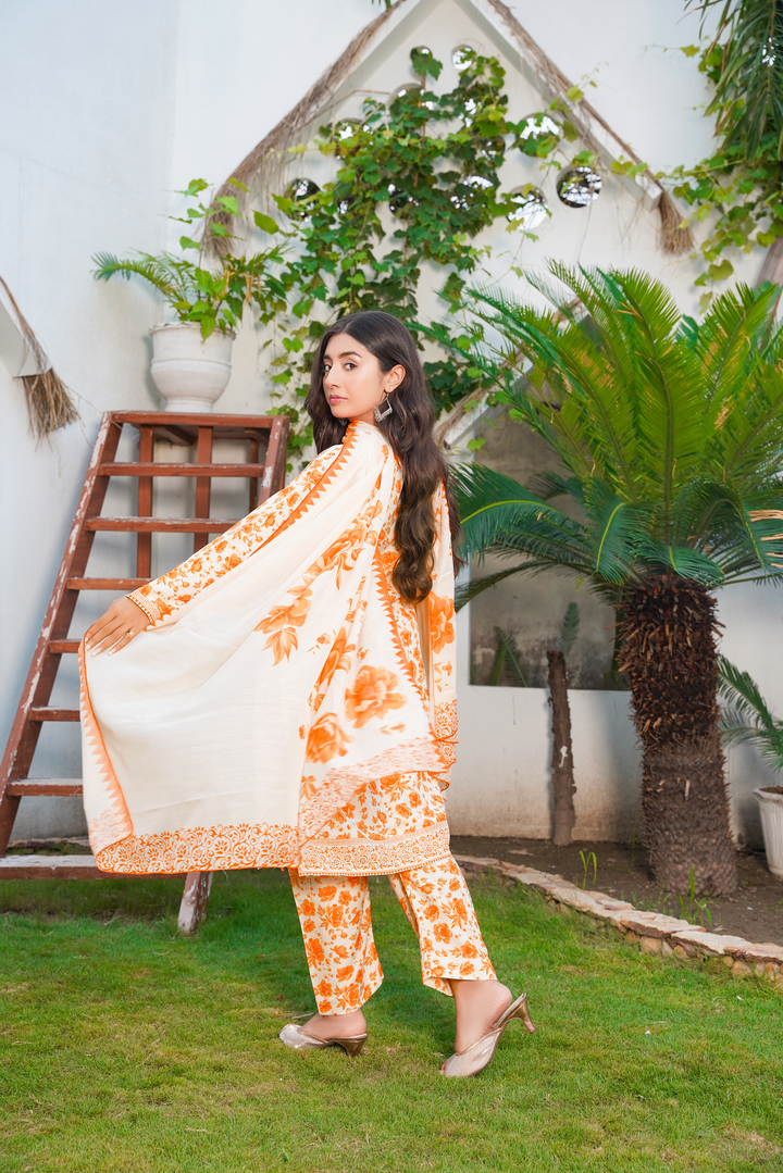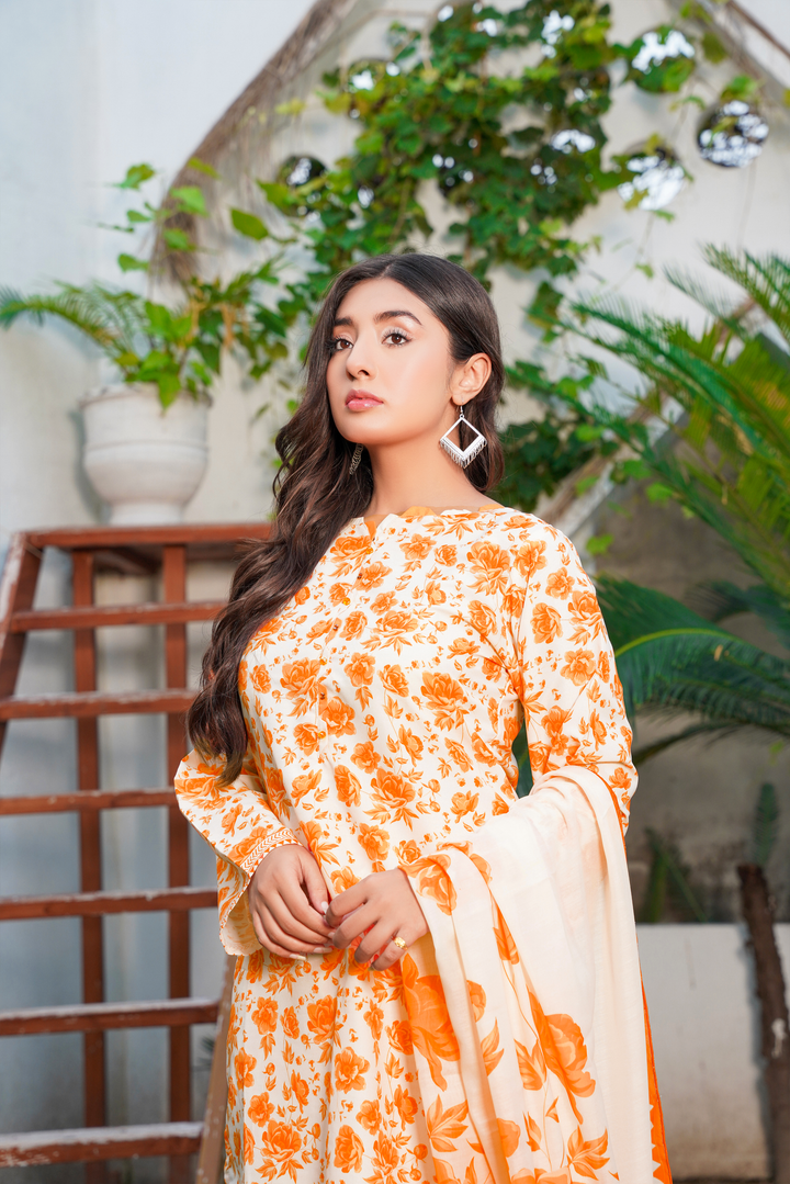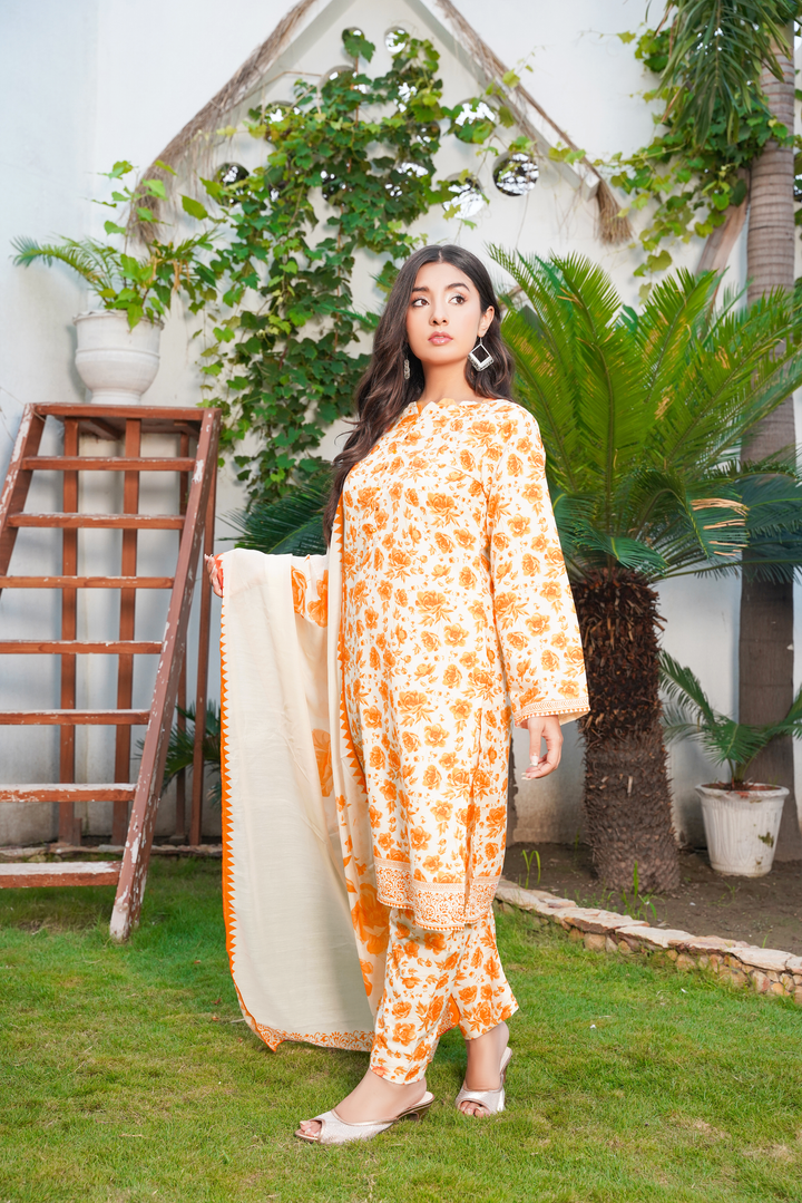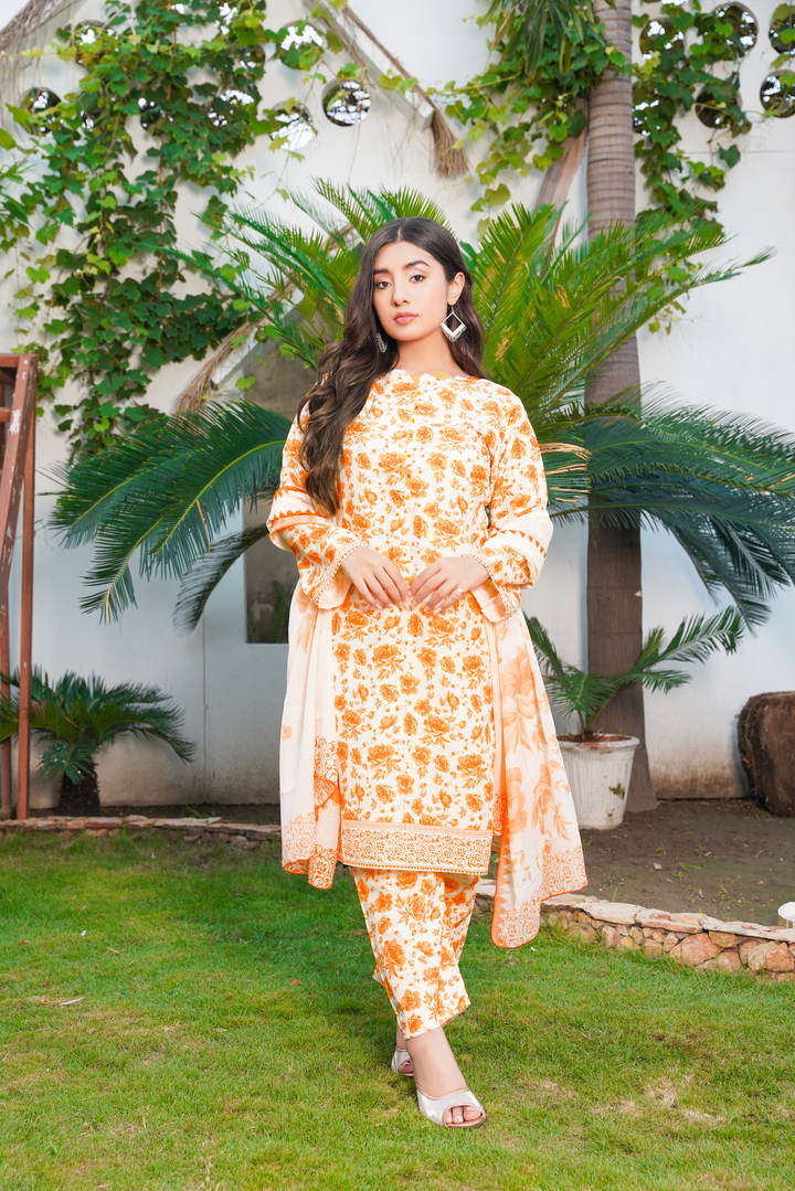 Elevate your wardrobe with the Tia Yellow Gold Lawn Dress, a striking blend of tradition and modernity. Crafted in a soft mustard tone, this outfit brings back the charm of classic printed shalwar kameez design with a contemporary twist.
