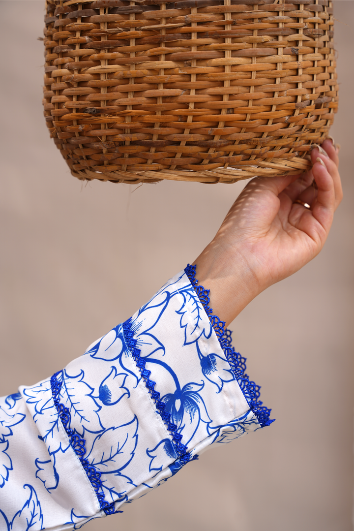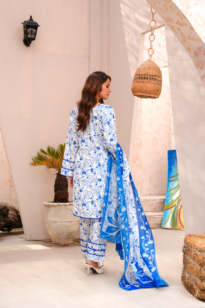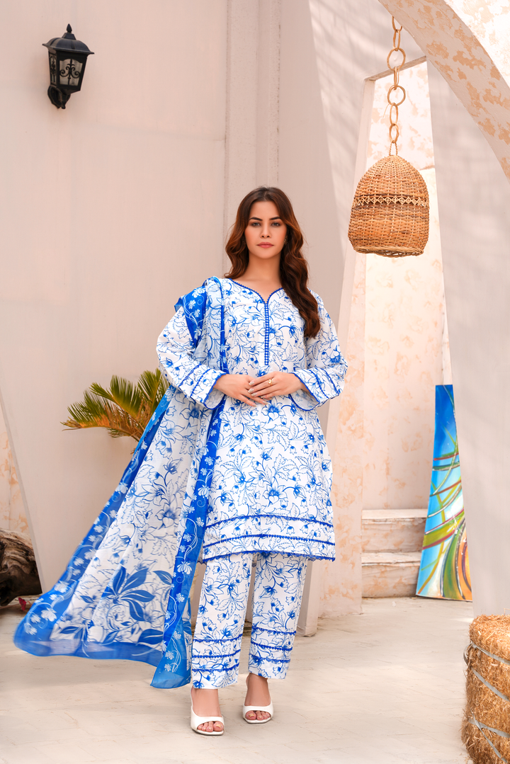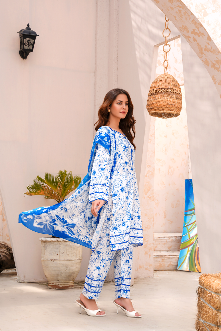 Grace your summer wardrobe with this effortlessly elegant white kameez design paired with subtle blue accents. Crafted from premium lawn, this lawn shirt design is lightweight, breathable, and perfect for warm weather.